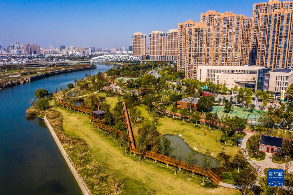 這是2021年11月12日拍攝的合肥市瑤海區南淝河初期雨水治理下沉式綠地工程(無(wú)人機照片)。