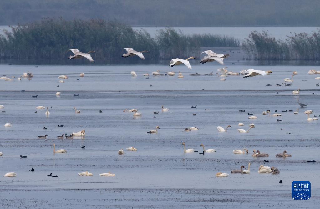 11月11日,天鵝等鳥(niǎo)類(lèi)在廬江縣黃陂湖棲息。