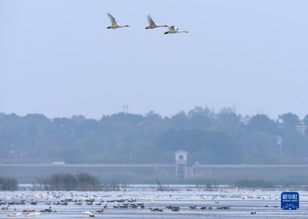 11月11日,天鵝在廬江縣黃陂湖上飛翔。