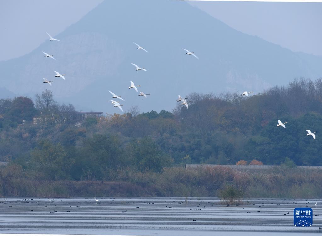 11月11日,天鵝在廬江縣黃陂湖上飛翔。