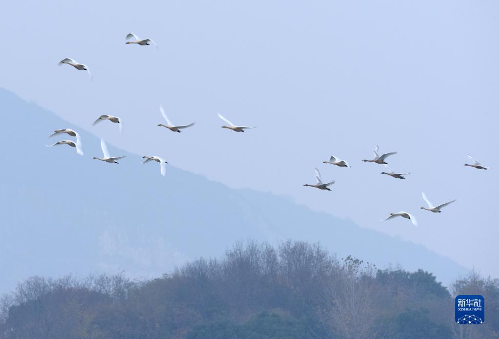 11月11日,天鵝在廬江縣黃陂湖上飛翔。