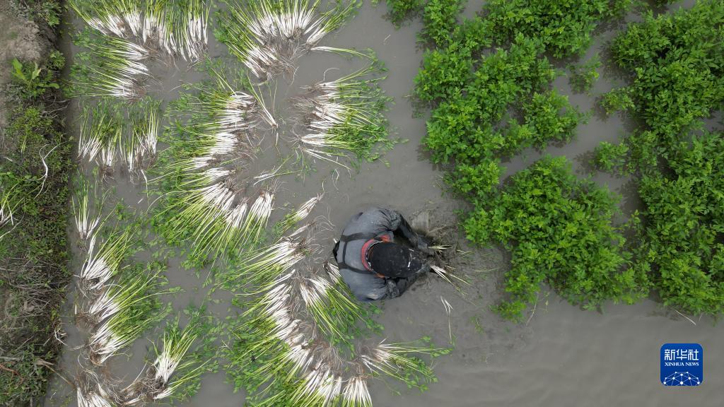 11月14日,江蘇省太倉市雙鳳鎮勤力村“水八仙”蔬菜種植基地,菜農在采收水芹菜(無(wú)人機照片)。