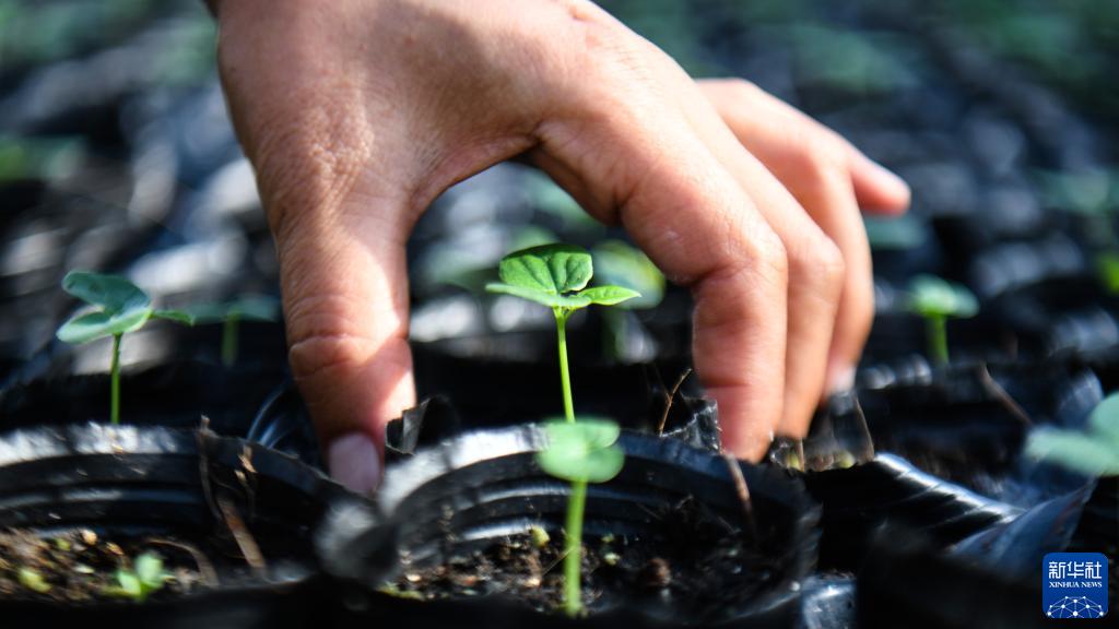在“黃金百香果”種苗培育基地,一名工人在培植“黃金百香果”種苗(11月10日攝)。