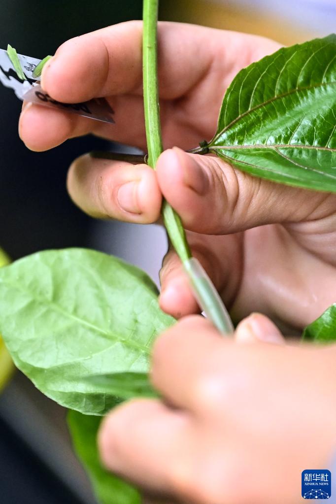 在“黃金百香果”種苗培育基地,一名工人在嫁接“黃金百香果”種苗(11月10日攝)。