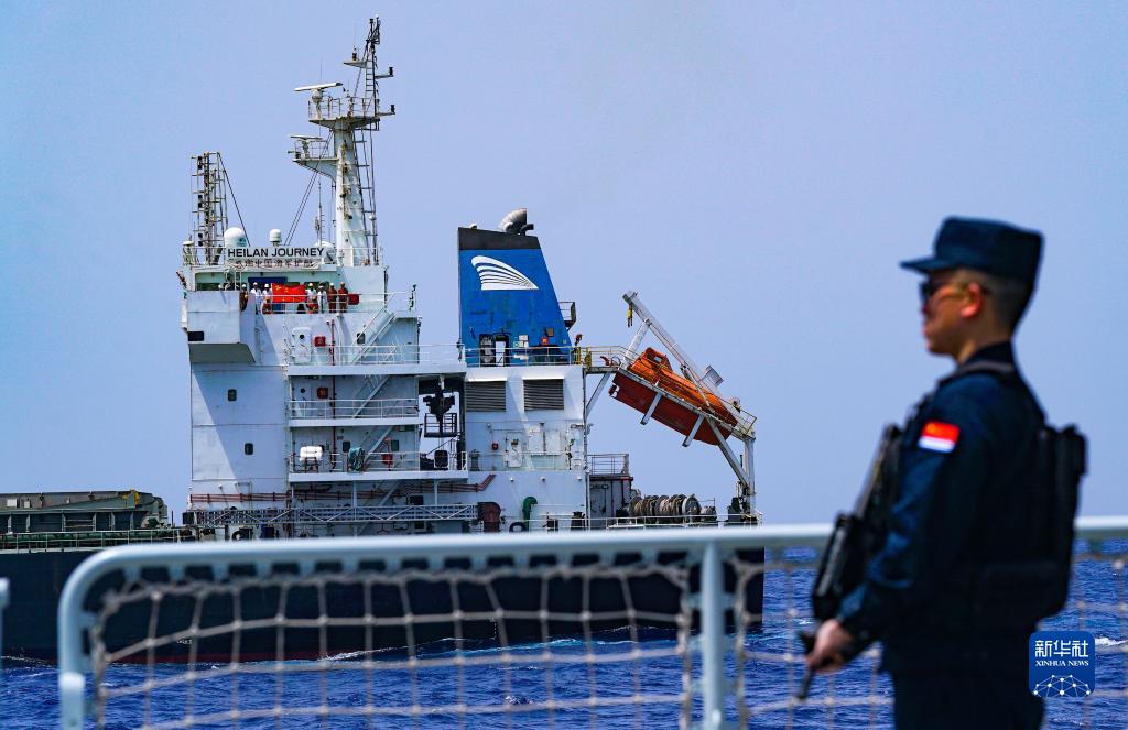 巴拿馬籍被護商船向中國海軍第41批護航編隊打出“感謝中國海軍護航”字樣的橫幅(6月22日攝)。