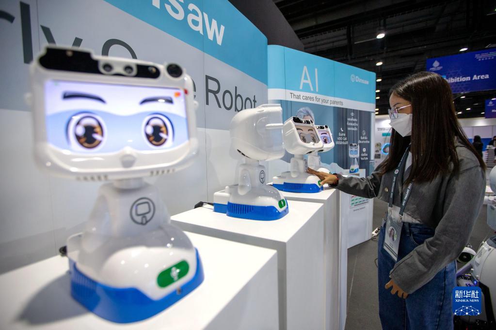 11月14日,在泰國首都曼谷,工作人員在A(yíng)PEC會(huì )議媒體中心與機器人互動(dòng)。