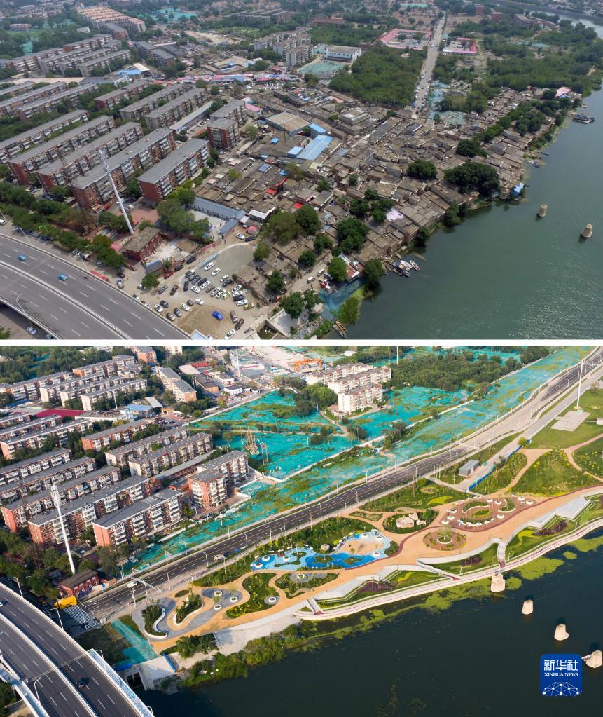 拼版照片:上圖為天津市紅橋區子牙河北岸搬遷改造前的“漁村”舊貌(資料照片);下圖為2021年10月11日拍攝的天津市紅橋區子牙河濱河公園(無(wú)人機照片)。