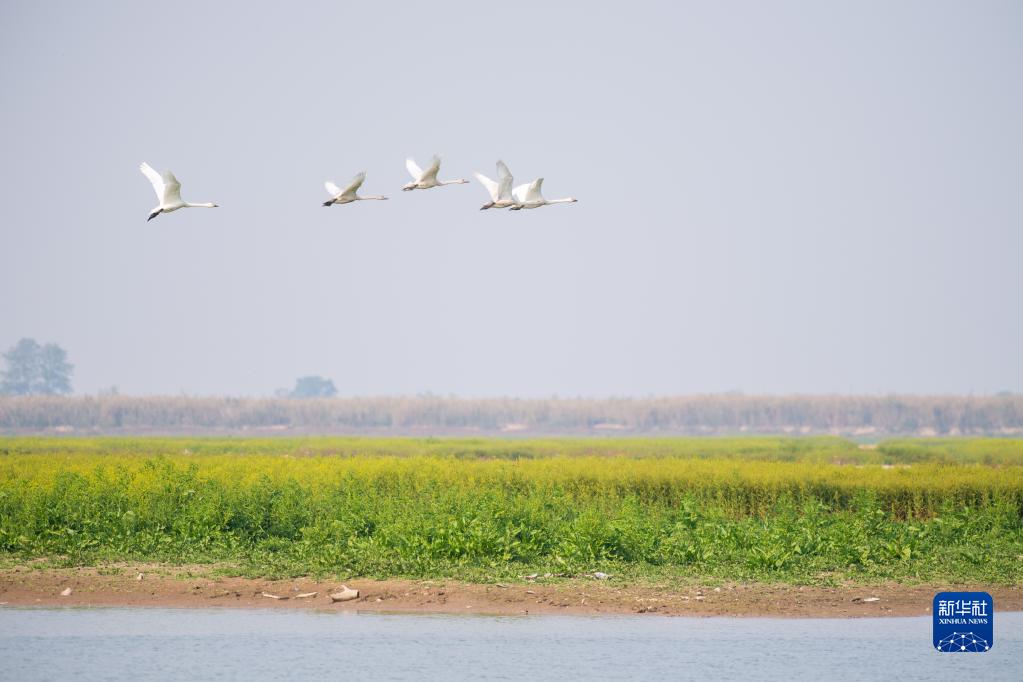 11月10日,成群的小天鵝在湖南西洞庭湖國家級自然保護區飛翔。 新華社記者陳思汗攝