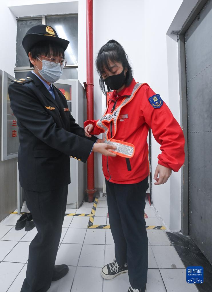 11月17日,龍泉街道應急管理中心工作人員指導超市員工穿戴疏散引導員的反光背心。