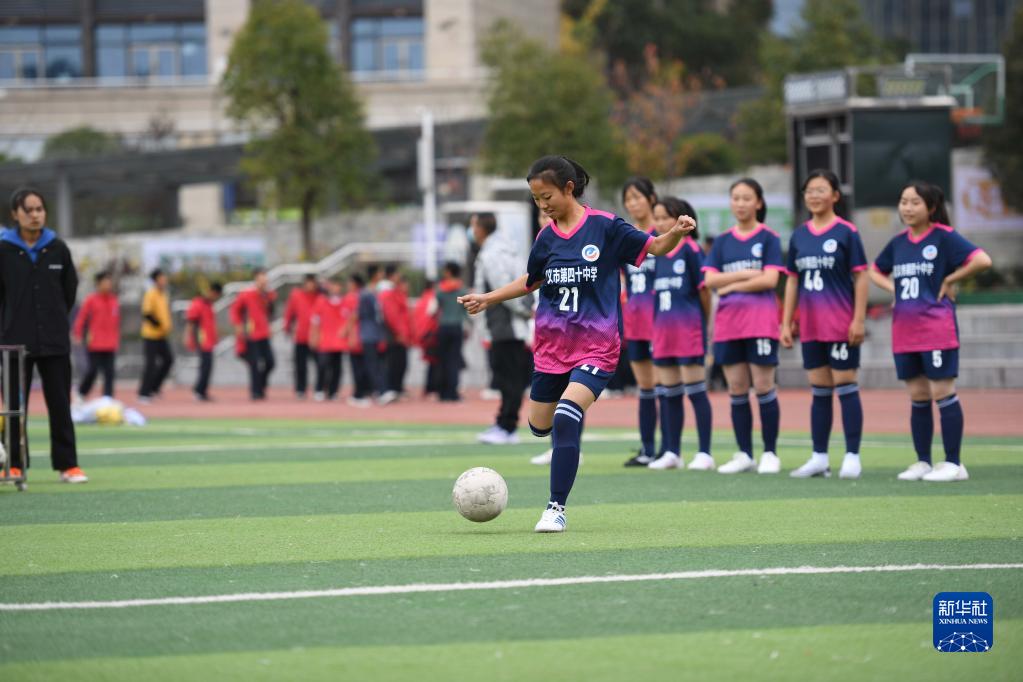 11月17日,學(xué)生在貴州省遵義市第四十中學(xué)練習足球。