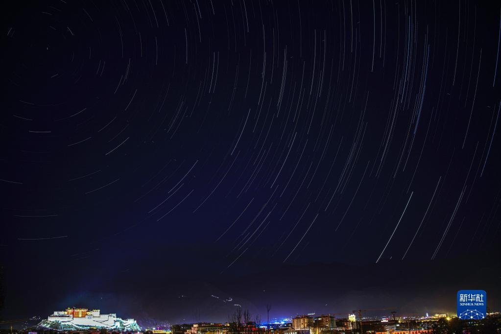這是在拉薩市南山公園拍攝的以布達拉宮為前景的星軌照片(合成照片,11月15日攝)。