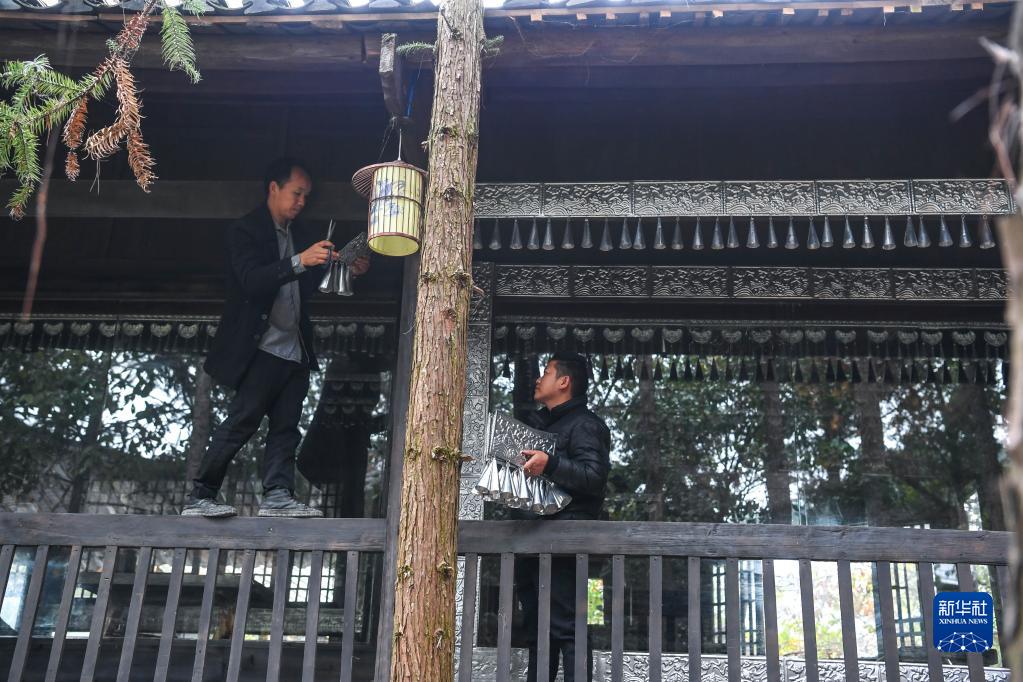 村民在貴州省丹寨縣龍泉鎮卡拉村的苗族吊腳樓上懸掛銀飾裝飾品(11月16日攝)。