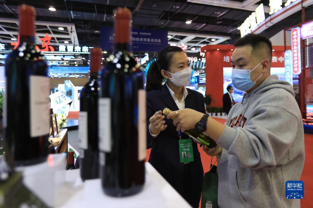 11月18日,參觀(guān)者在洽談會(huì )期間舉行的“綠色智造產(chǎn)業(yè)產(chǎn)品展”上了解展出的紅酒。