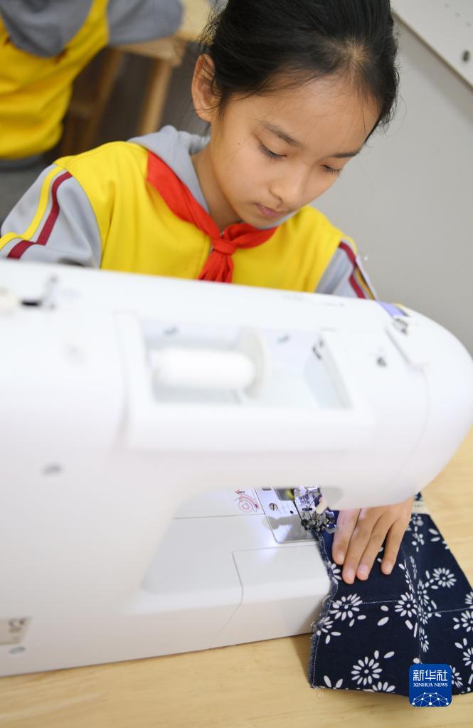 11月17日,天津市和平區中心小學(xué)的學(xué)生在學(xué)習使用縫紉機。