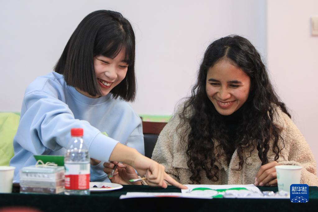11月16日,白書(shū)晴(右)在學(xué)校社團活動(dòng)上與中國學(xué)生交流。