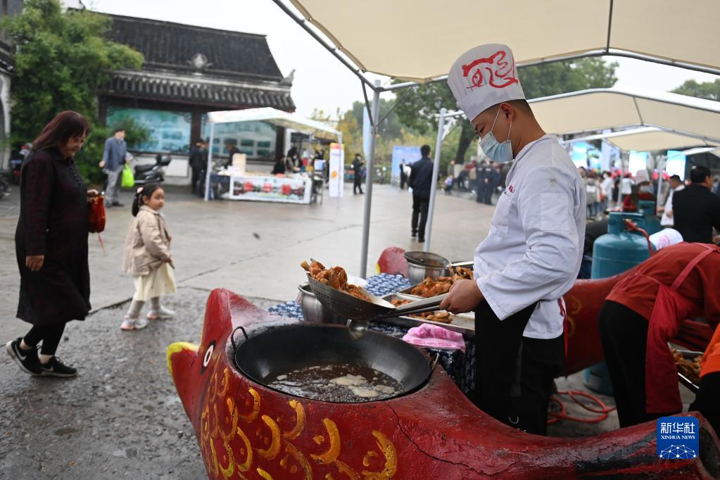 11月18日,和孚鎮荻港村的廚師在現場(chǎng)制作當地特色炸魚(yú)。