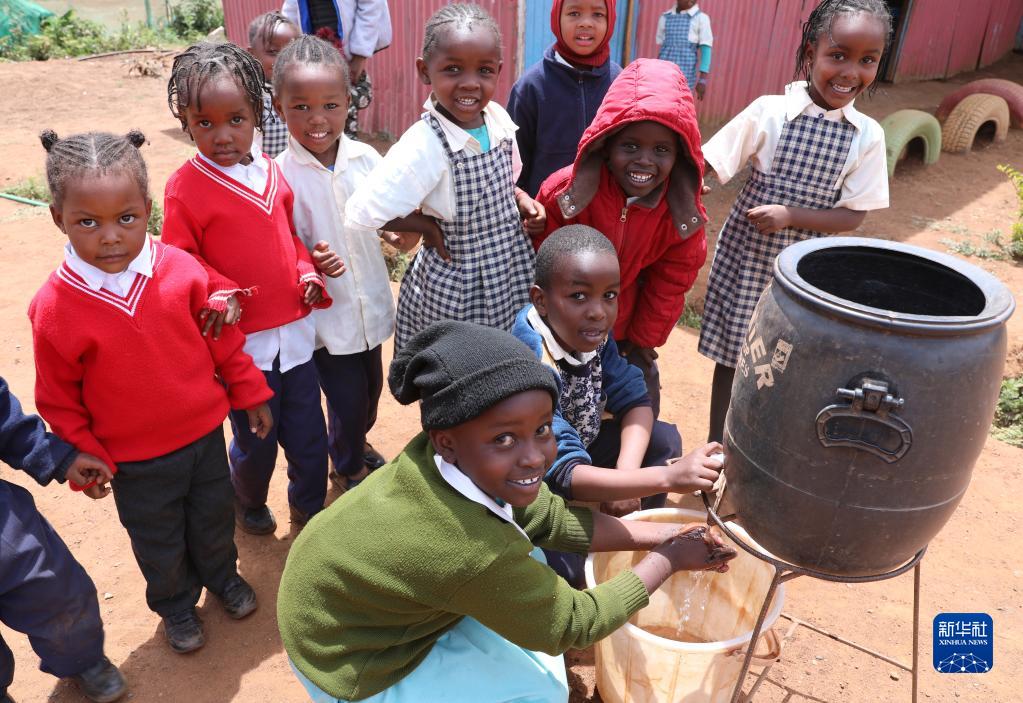 11月10日,在肯尼亞基姆卡的一座幼兒園,孩子們在吃飯前洗手。