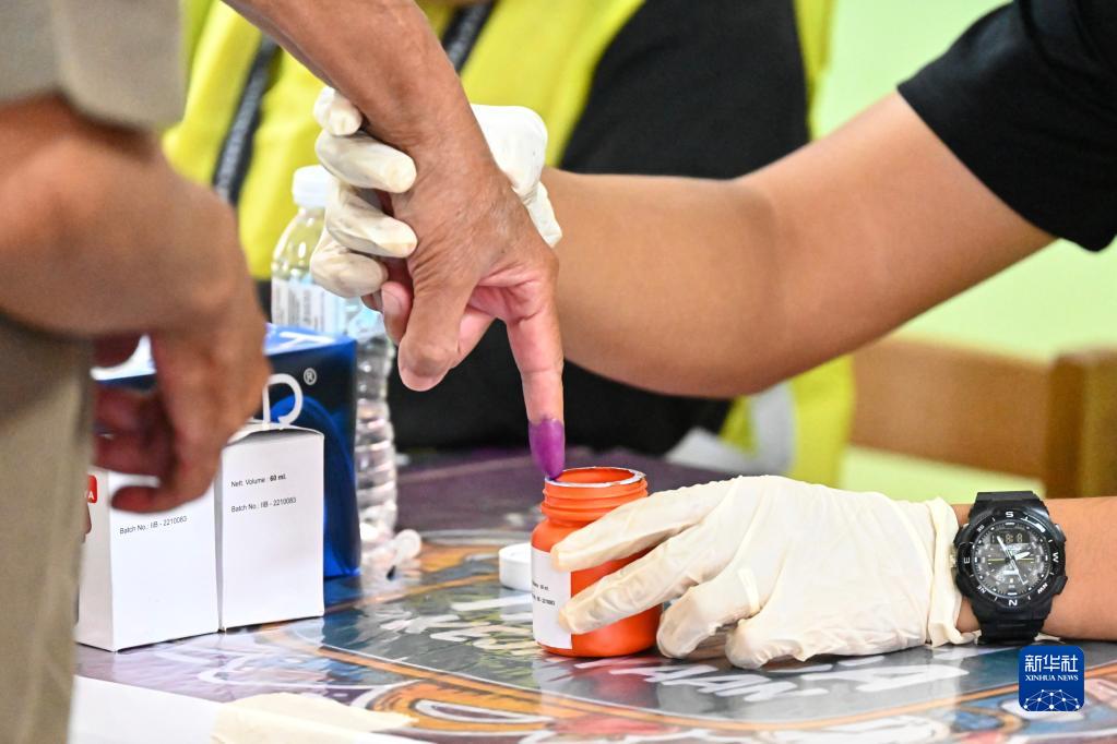 11月19日,在馬來(lái)西亞彭亨州貝拉的一處投票站,工作人員幫助選民將手指蘸上墨水。