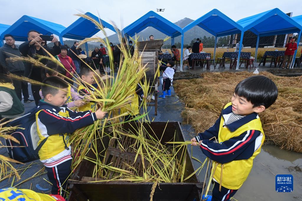 11月19日,孩子們在家長(cháng)的帶領(lǐng)下體驗傳統打稻谷。