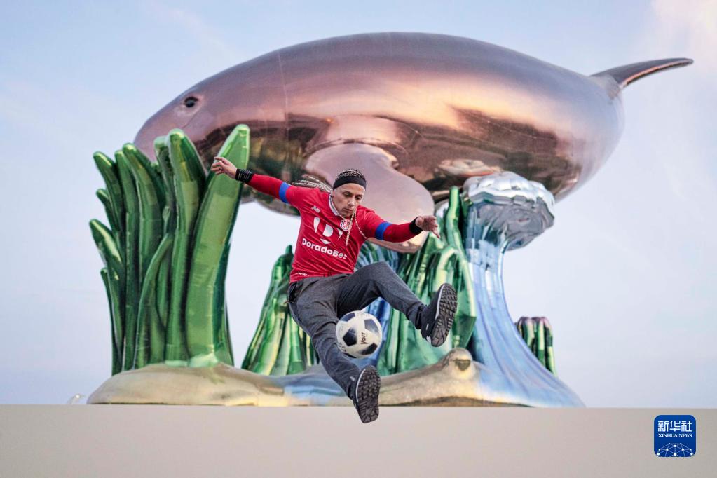 11月18日,來(lái)自哥斯達黎加的球迷基卡在一座公園內的雕塑前表演街頭足球。