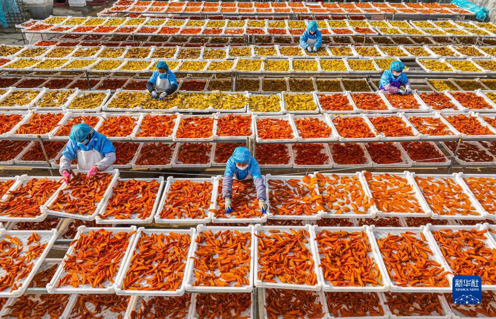 11月19日,在山東省榮成市埠柳鎮東初家村一家甘薯加工企業(yè),工人利用晴好天氣,抓緊晾曬甘薯干。近年來(lái),榮成市埠柳鎮成立甘薯產(chǎn)業(yè)合作聯(lián)社,以農產(chǎn)品加工企業(yè)帶動(dòng)周邊農村進(jìn)行甘薯規?;N植,帶動(dòng)農村集體經(jīng)濟的發(fā)展。