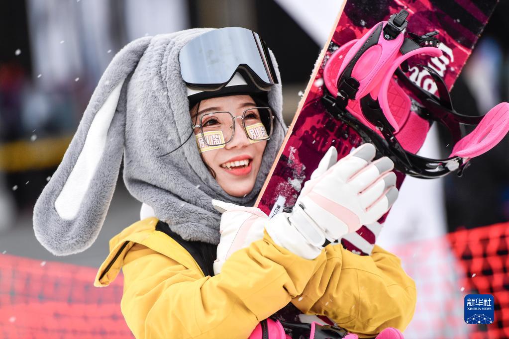 11月19日,滑雪愛(ài)好者在萬(wàn)科松花湖度假區滑雪場(chǎng)抱著(zhù)滑雪板拍照留念。