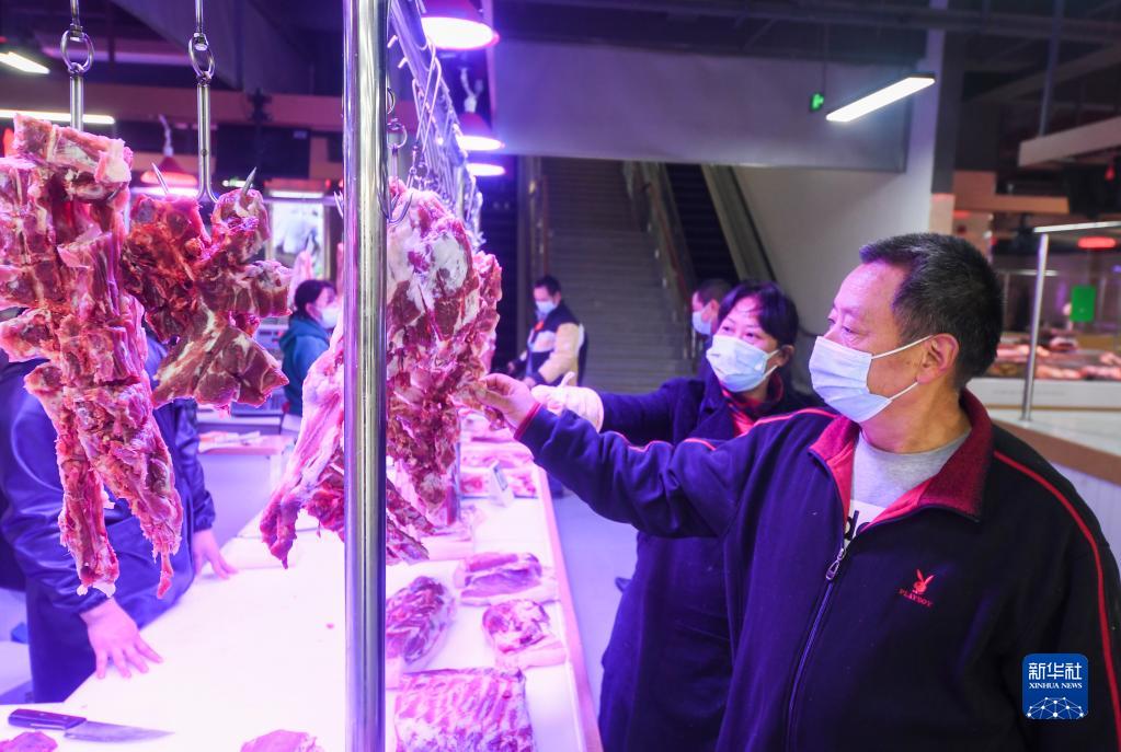11月19日,消費者(右一)在重慶市璧山區一農貿市場(chǎng)選購豬肉。