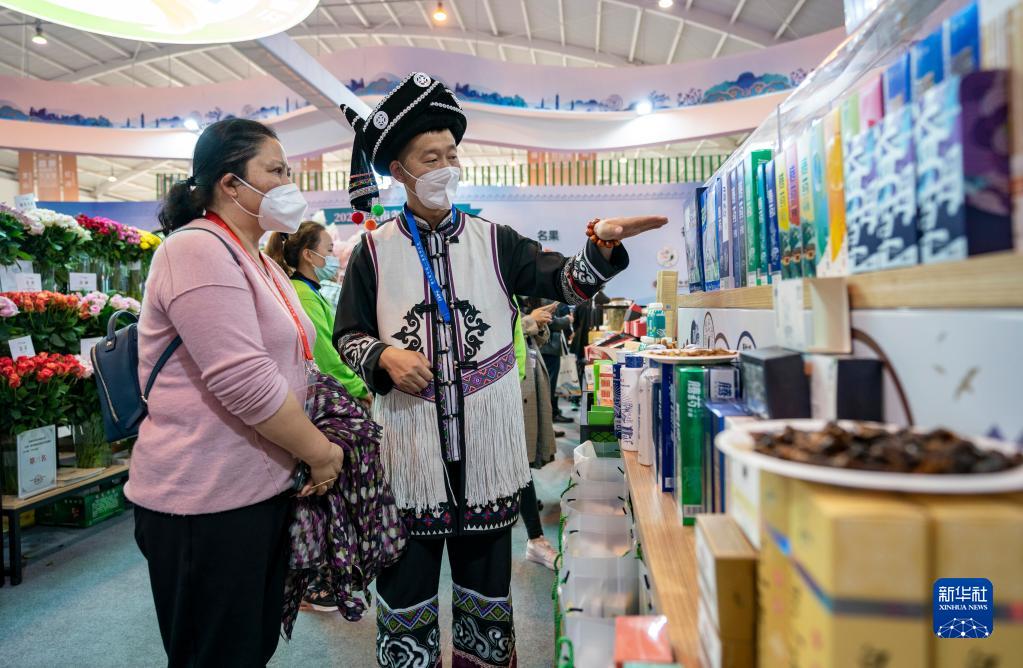 11月19日,一名參展商(右)在南博會(huì )現場(chǎng)介紹特色商品。