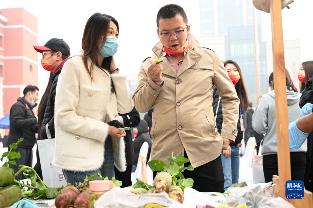 在天津市西青區辛口鎮第十五屆沙窩蘿卜文化旅游節上,參觀(guān)者在品嘗沙窩蘿卜(11月18日攝)。