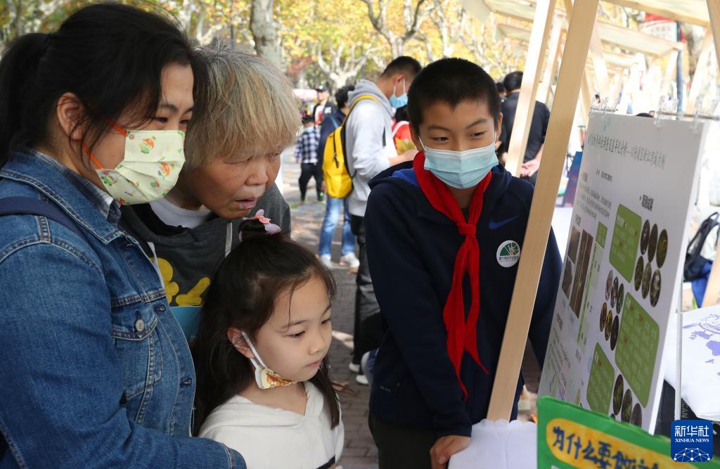 11月20日,復旦大學(xué)第二附屬學(xué)校的田一禾同學(xué)(右)在科學(xué)集市上向參觀(guān)者介紹他在居民小區內進(jìn)行的城市生物多樣性調查成果。