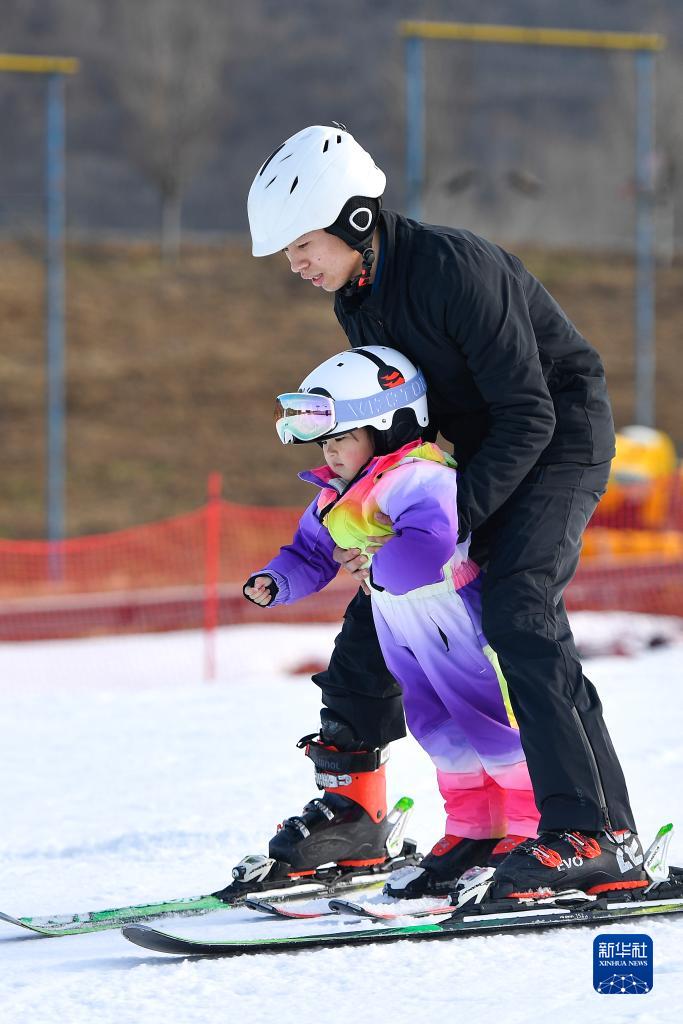 11月20日,在吉林市萬(wàn)科松花湖度假區,一名小朋友在陪伴下體驗滑雪。