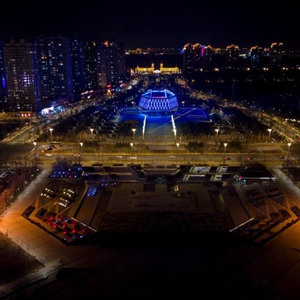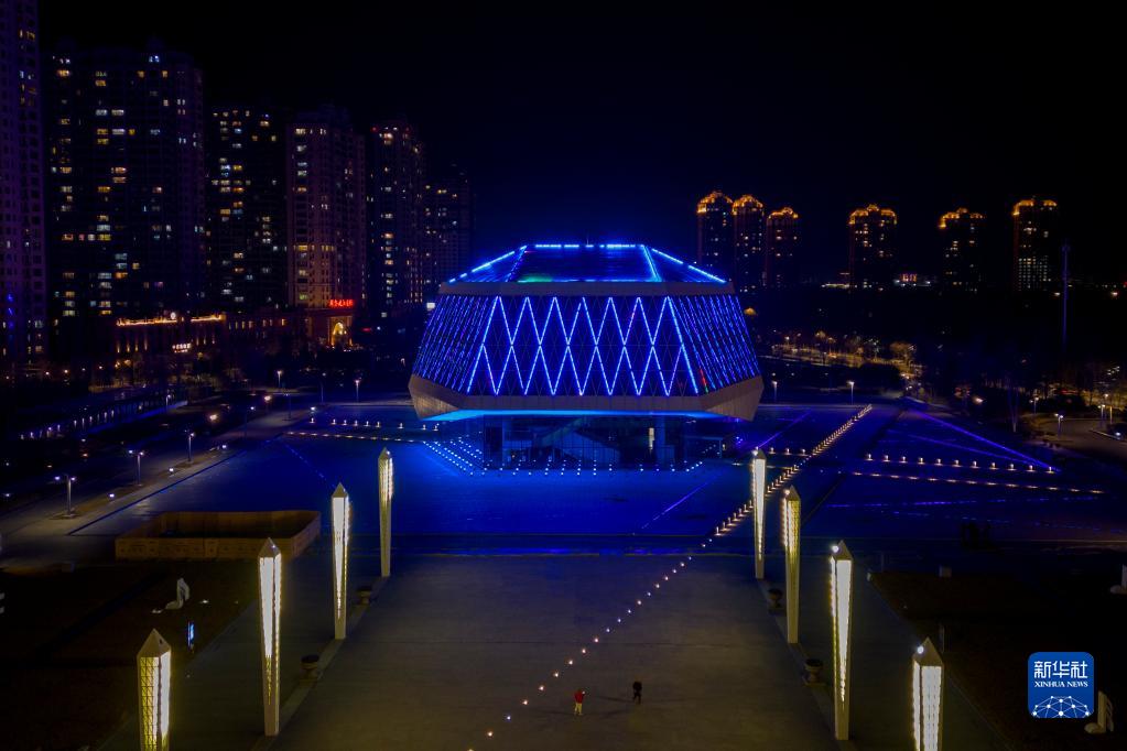 11月20日,哈爾濱音樂(lè )廳為世界兒童日亮燈(無(wú)人機照片)。