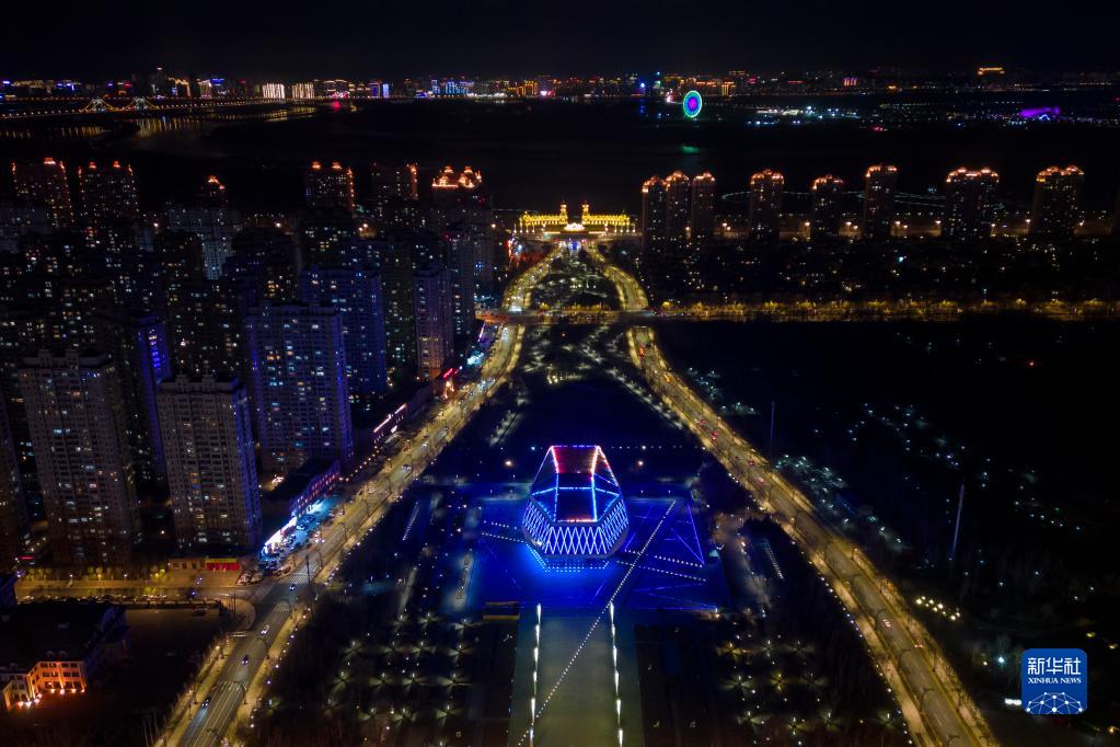 11月20日,哈爾濱音樂(lè )廳為世界兒童日亮燈(無(wú)人機照片)。