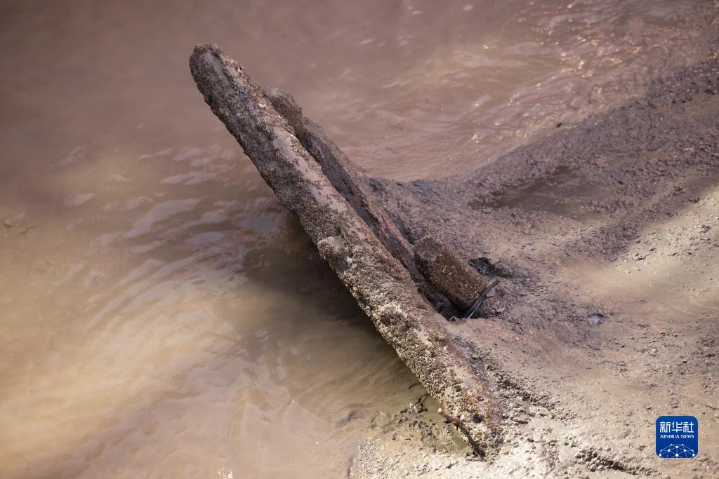 11月21日清晨拍攝的露出水面的古船船體局部。