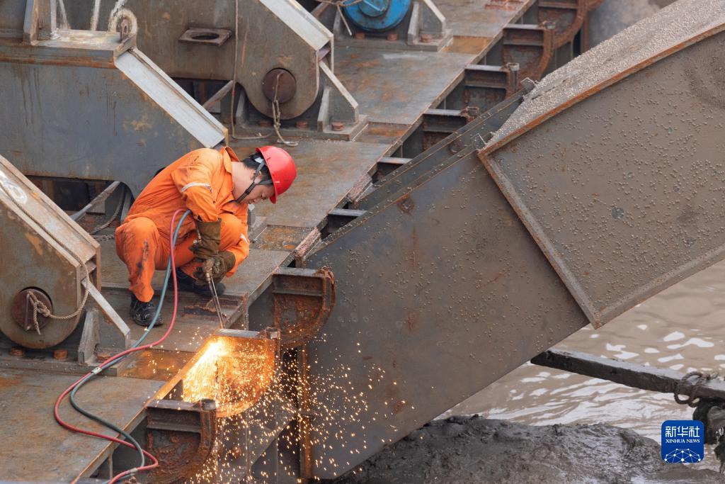 11月21日清晨,工作人員在進(jìn)行固定古船船體工作。