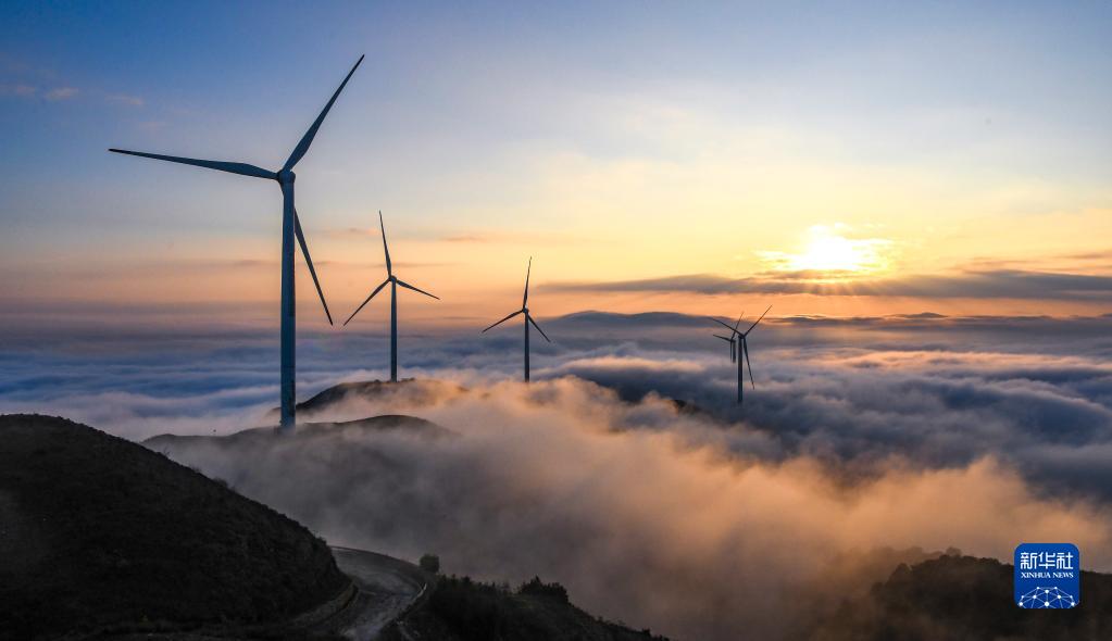 11月20日,在湖南省桂陽(yáng)縣,風(fēng)力發(fā)電機與云海景觀(guān)相互映襯。