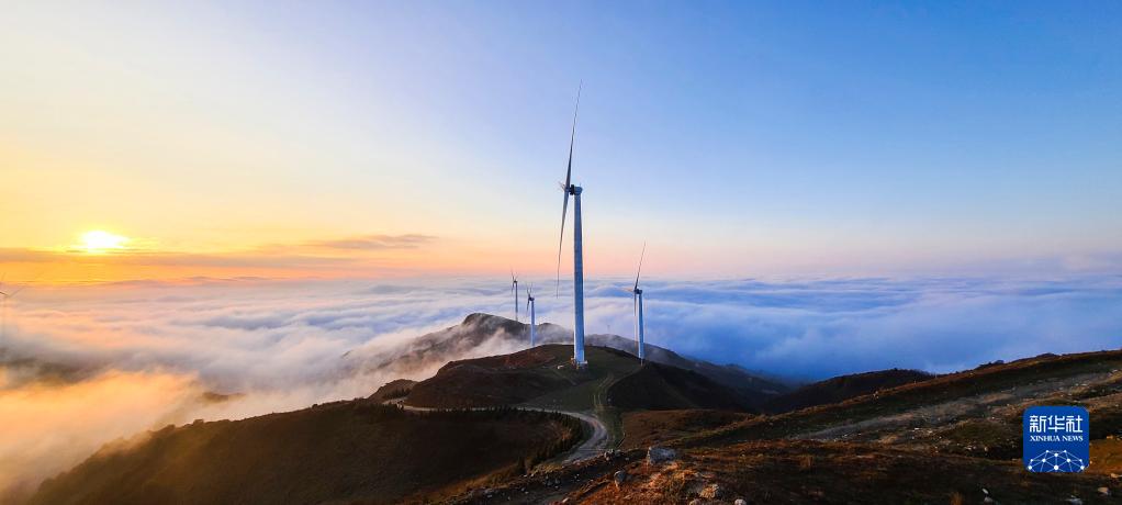 11月20日,在湖南省桂陽(yáng)縣,風(fēng)力發(fā)電機與云海景觀(guān)相互映襯。