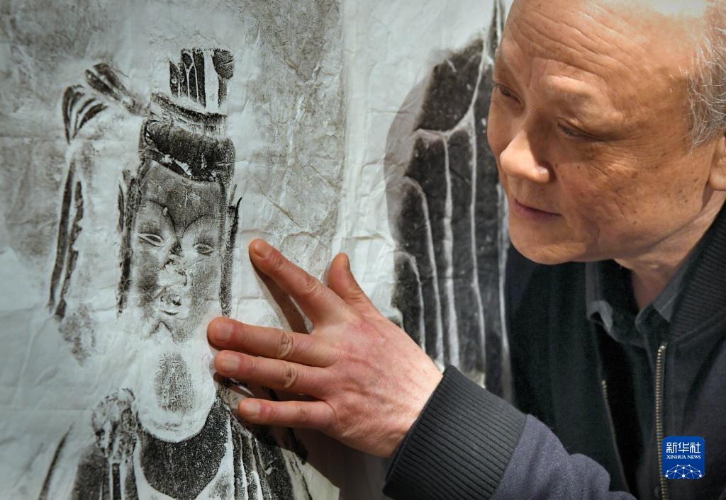 與傳統的平面拓印不同,高浮雕拓印需要將濕透的宣紙沿立體雕像輪廓剪開(kāi),直壓在各個(gè)部位,因此拓印后的宣紙呈碎片狀,而李仁清則需要把成百上千張的碎片粘接在一起,形成一整幅平面作品。高浮雕傳拓技藝將不可移動(dòng)文物按1:1的比例轉化為可移動(dòng)文物,甚至可以將石刻上的裂隙、剝蝕等病害記錄下來(lái),為觀(guān)察和保護文物提供準確信息。