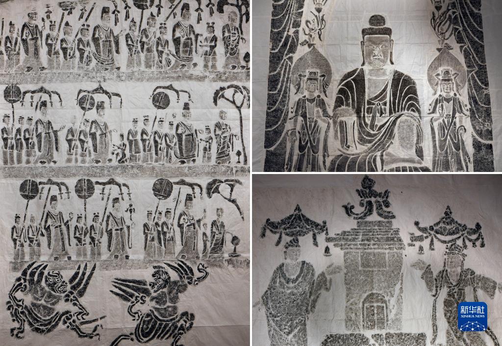 與傳統的平面拓印不同,高浮雕拓印需要將濕透的宣紙沿立體雕像輪廓剪開(kāi),直壓在各個(gè)部位,因此拓印后的宣紙呈碎片狀,而李仁清則需要把成百上千張的碎片粘接在一起,形成一整幅平面作品。高浮雕傳拓技藝將不可移動(dòng)文物按1:1的比例轉化為可移動(dòng)文物,甚至可以將石刻上的裂隙、剝蝕等病害記錄下來(lái),為觀(guān)察和保護文物提供準確信息。