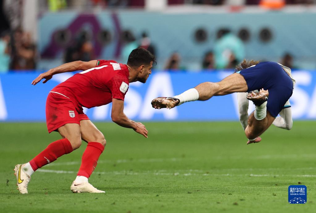 11月21日,英格蘭隊球員格拉利什(右)被伊朗隊球員普拉利甘吉鏟倒。