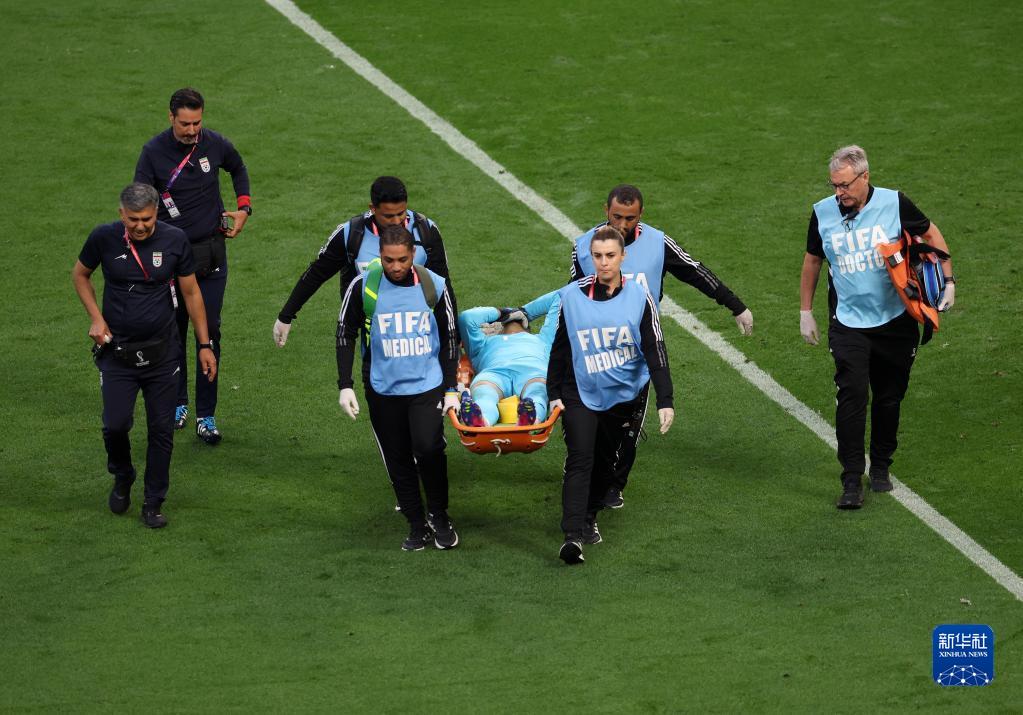 11月21日,伊朗隊守門(mén)員貝蘭萬(wàn)德受傷后被抬出場(chǎng)外。