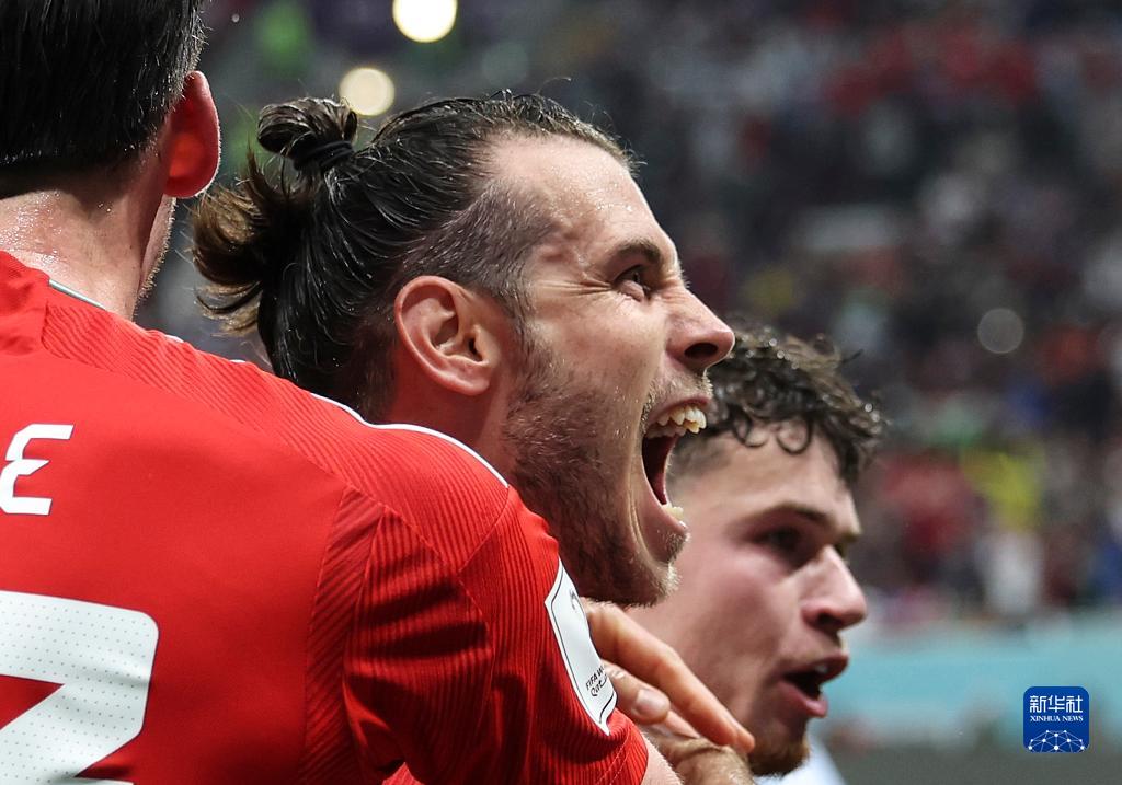 11月21日,威爾士隊球員加雷斯·貝爾(中)在比賽中慶祝進(jìn)球。