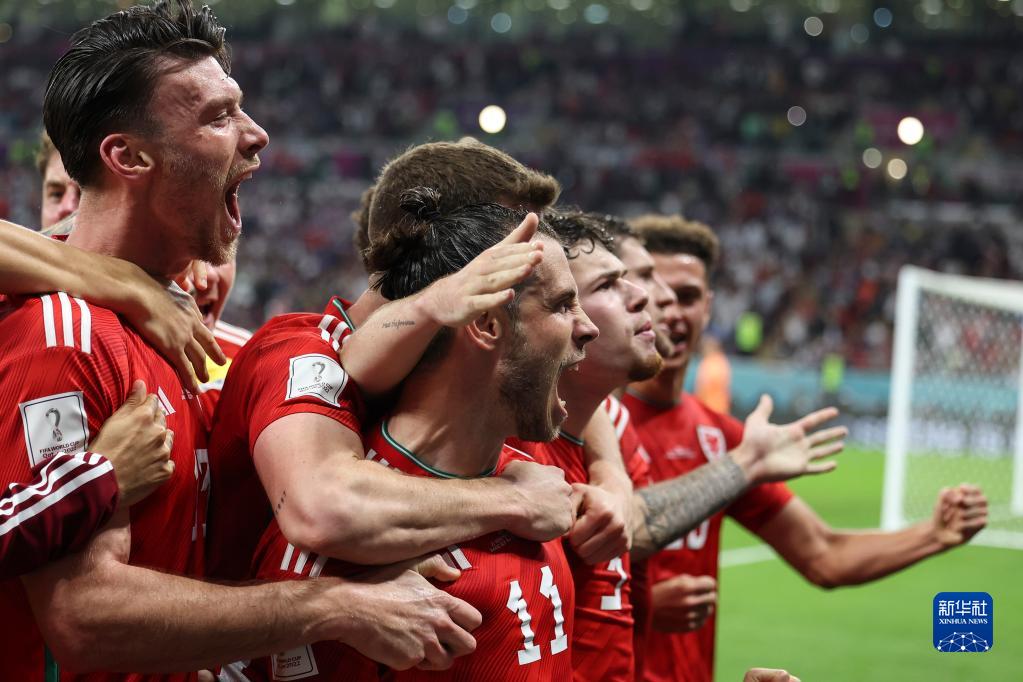 11月21日,威爾士隊球員加雷斯·貝爾(中)與隊友在比賽中慶祝進(jìn)球。