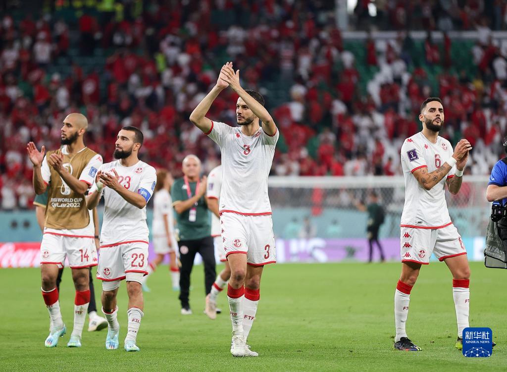 11月22日,突尼斯隊球員艾薩·萊杜尼、納伊姆·斯利蒂、莫塔薩爾·塔爾比和迪倫·布朗恩(從左至右)賽后向觀(guān)眾致意。