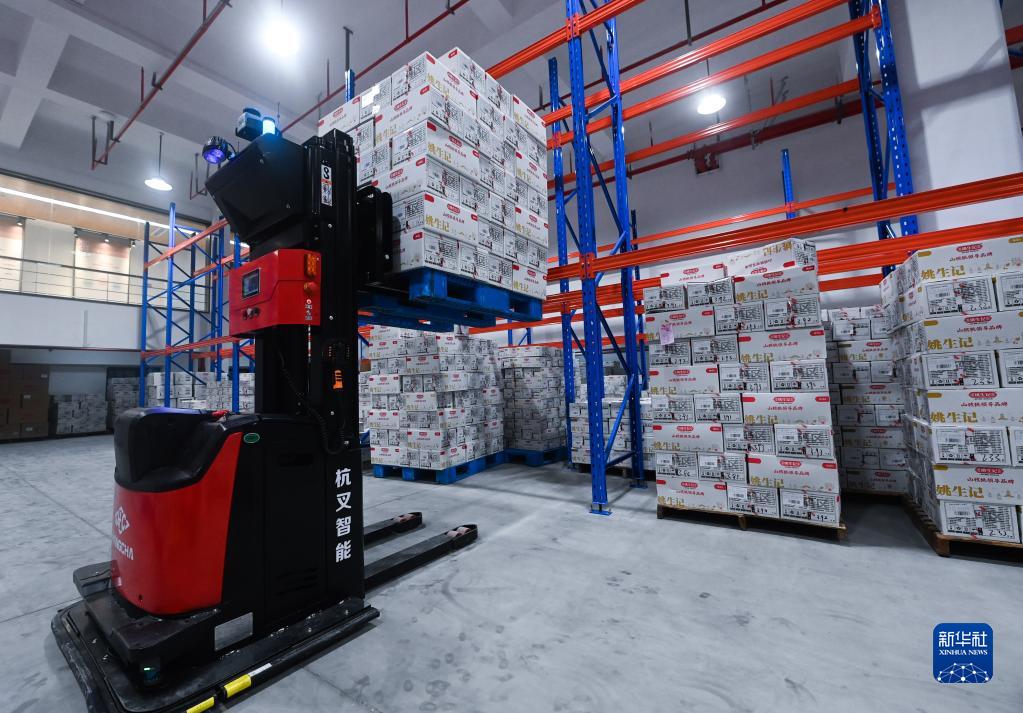 11月22日,全自動(dòng)智能叉車(chē)在杭州市臨安區龍崗鎮一家現代化數字工廠(chǎng)的倉庫內碼放貨物。