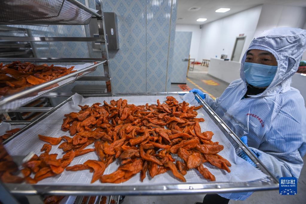 11月23日,在浙江省建德市更樓街道橋嶺村共富工坊的工作人員在碼放剛剛從烘箱里拿出來(lái)的地瓜干。