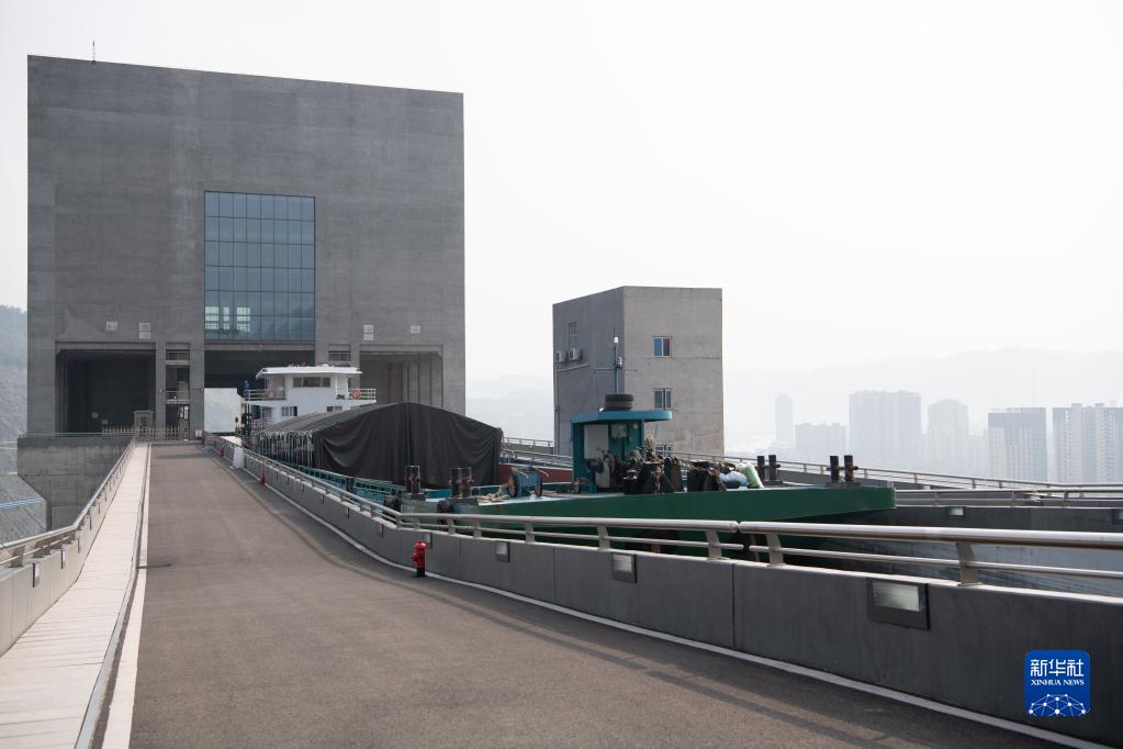 11月22日,一艘貨船經(jīng)向家壩水電站升船機翻越向家壩水電站大壩。