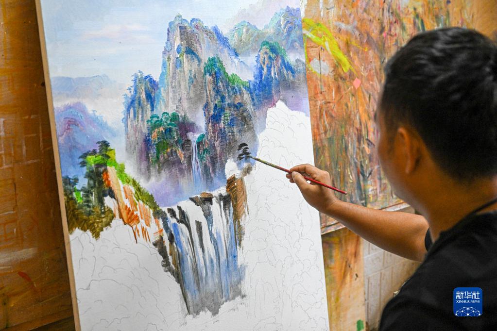 11月21日,一名畫(huà)師在海南省屯昌縣油畫(huà)步行街一家畫(huà)廊內作畫(huà)。