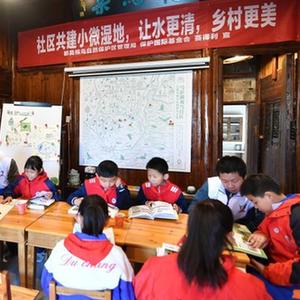 學(xué)生和志愿者在江西省九江市都昌縣樟樹(shù)許村的候鳥(niǎo)書(shū)屋閱讀候鳥(niǎo)相關(guān)書(shū)籍(11月23日攝)。