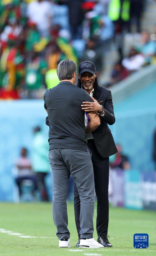 11月24日,喀麥隆隊主教練里格貝特·宋(右)與瑞士隊主教練穆拉特·亞金在賽后相互致意。